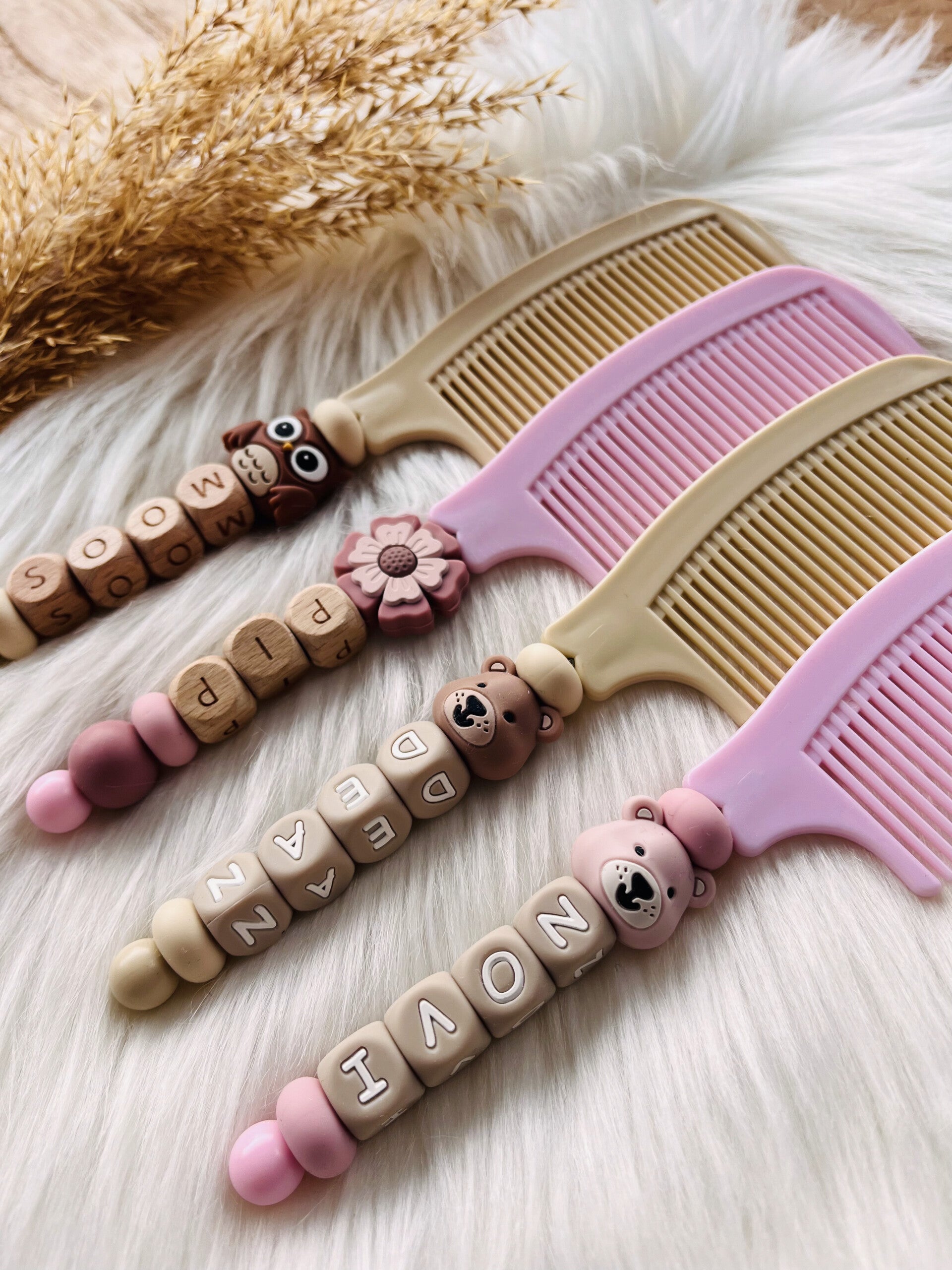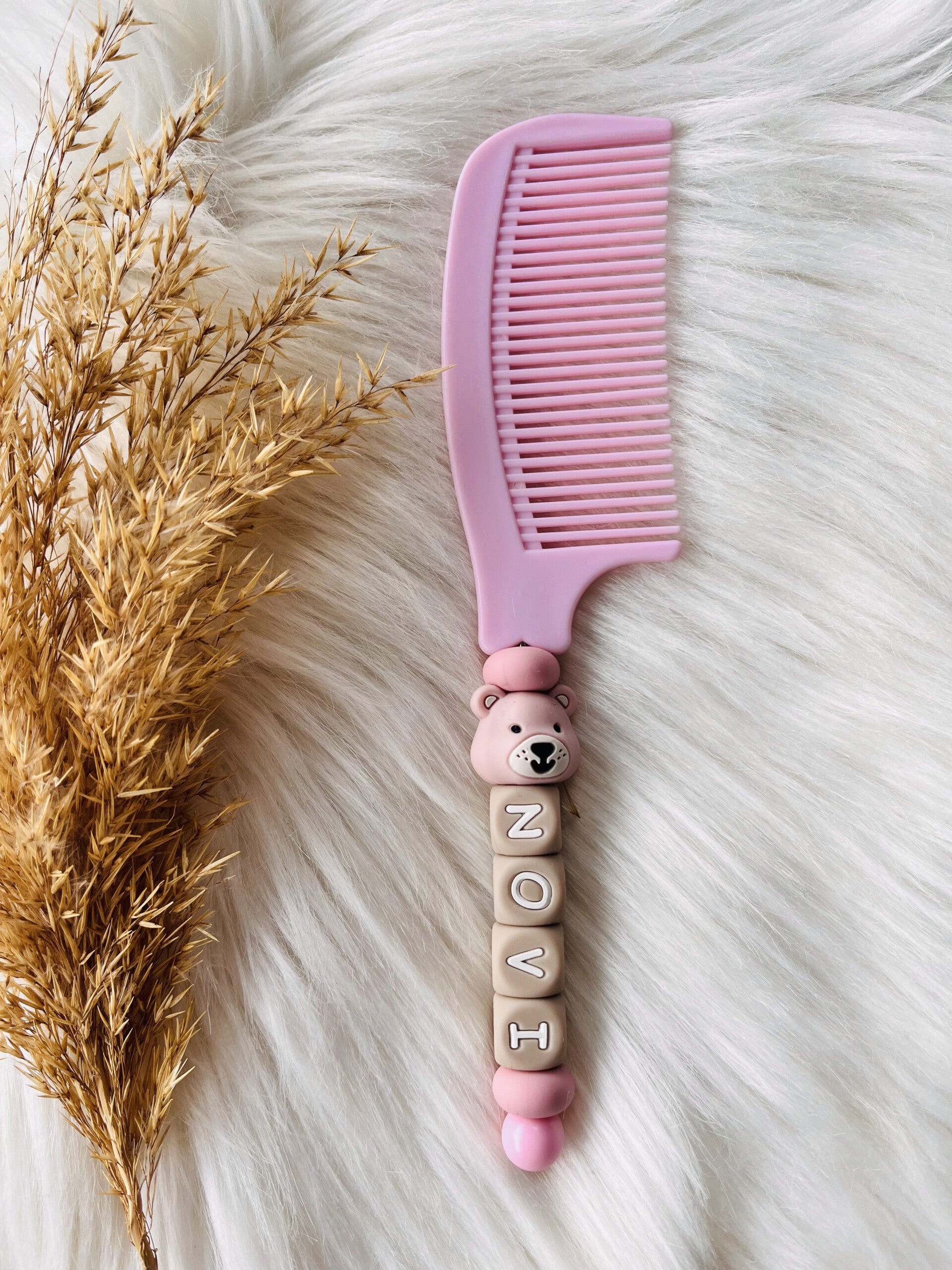 De kam is uitgevoerd in een zachte roze tint en afgewerkt met een detail van kralen, waaronder naamkralen met de naam van het kindje. Zo wordt elk exemplaar uniek.